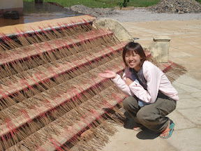 ok, i have never put any thought into how incense sticks were made. huh, not factory made meh? now we know that a little lady in a temple in dalat makes each incense stick by hand, taking a pink-painted bamboo stick, and rolling some cinnamon powder together with that sticky paste to make each incense stick.